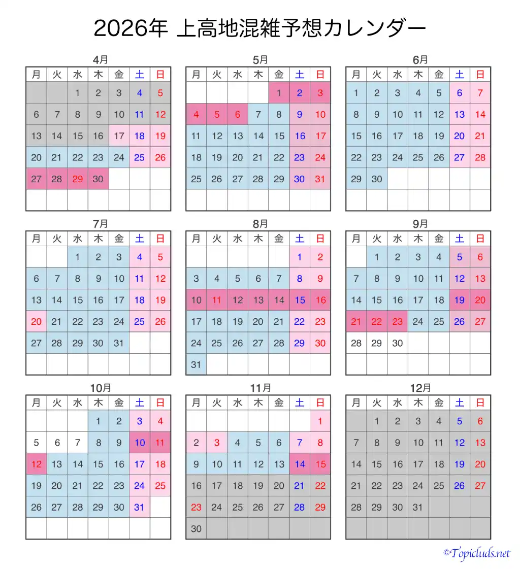 上高地の混雑している日と空いている日がひと目で分かる「上高地の混雑予想カレンダー」、2026年(令和8年)版です。